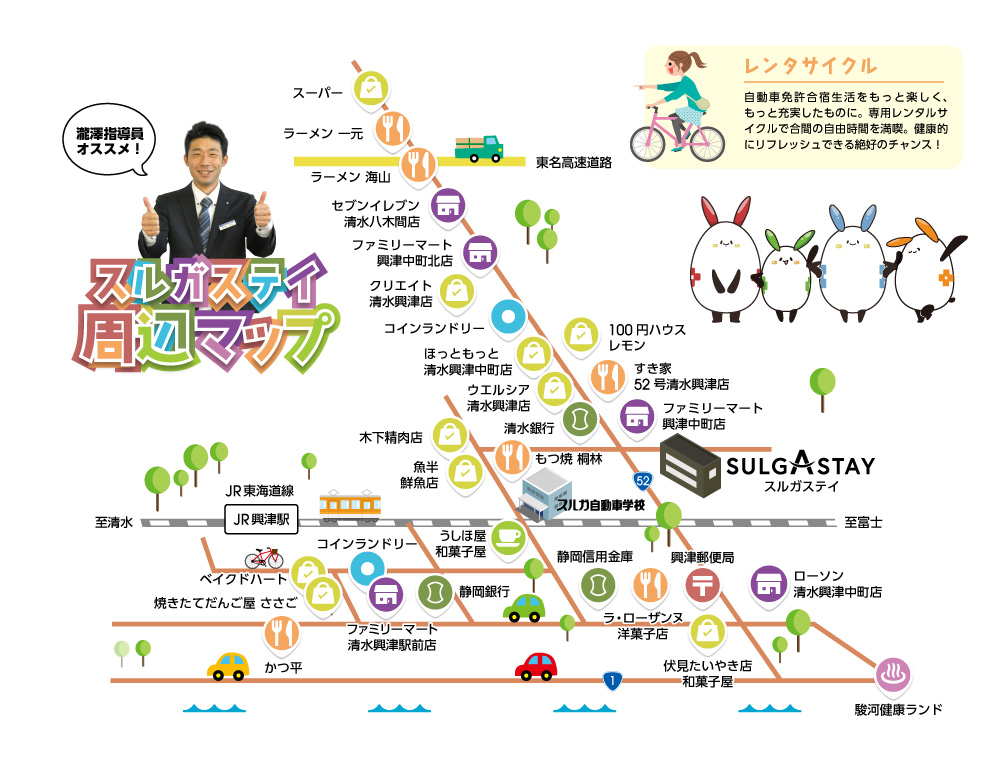 学校の無料レンタサイクルを利用すれば、行きたい場所にもスムーズにアクセスできます。(スルガ自動車学校&直営宿舎スルガステイ 周辺マップ)