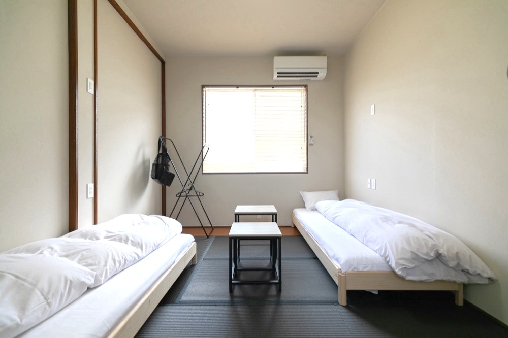 古民家を改装したゲストハウスです。2~5名グループでの申込受付となります。バス・トイレ・冷蔵庫は共同利用、建物内には長期滞在に嬉しいランドリーコーナーもございます。門限は22:00です。店主が猫を飼っている為、猫アレルギーの方はご注意ください。