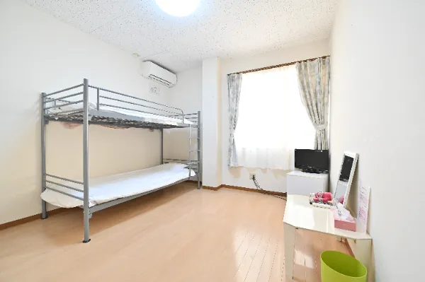 各部屋2段ベッドを配置しています。2人で使用するツインと、1人で1部屋使うシングルユースタイプとなっております。お部屋は個室ですがバス・トイレは共同タイプの寮となります。個室のシャワーブースもあります。